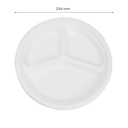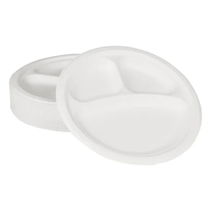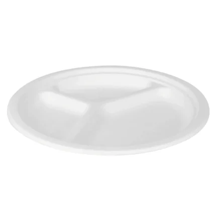10 Inch 3 Compartments PFAS-Free Bagasse Plates are eco-friendly, compostable plates made from natural bagasse fiber without harmful PFAS chemicals. Durable and sustainable, these plates are perfect for serving snacks and meals while supporting a greener environment.