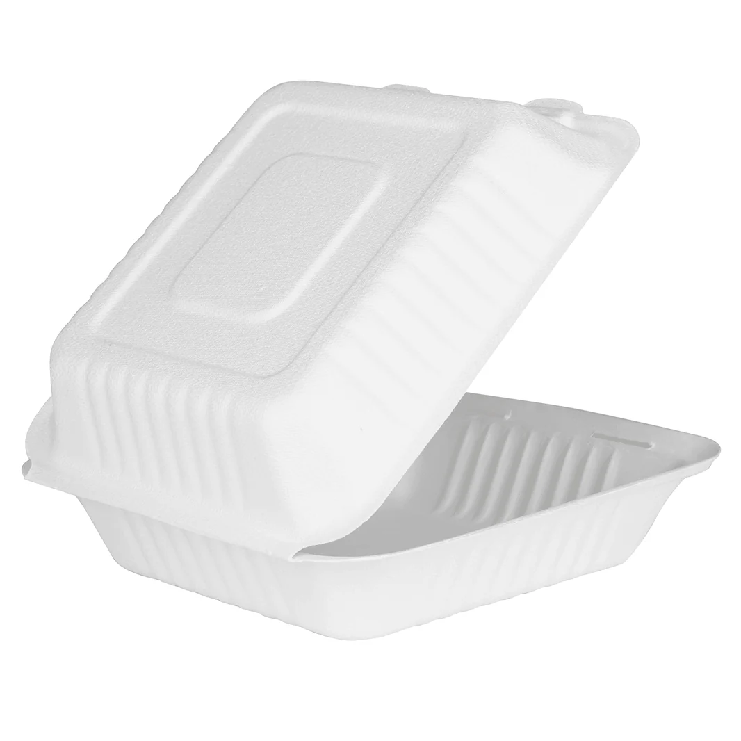 8 inch Single Compartment PFAS-Free Bagasse Clamshell Hinged Containers 200pcs/case